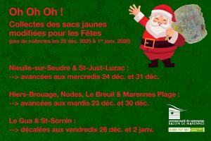 - Nieulle-sur-Seudre et Saint-Just-Luzac : collectes avancées aux mercredis 24 décembre et 31 décembre,
